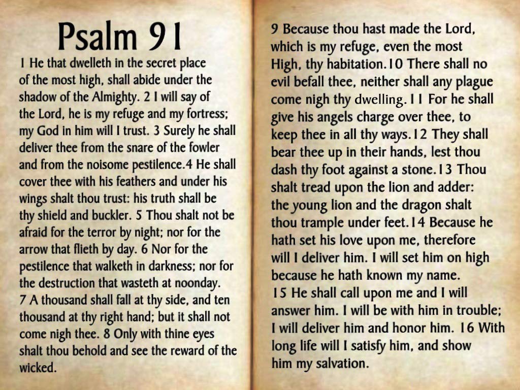 Psalms chapter 91 KJV King James Version 1 He that dwelleth in the secret place of the most High shall abide under the shadow of the Almighty. My God in Him I will trust. He desired the mercy promised and.